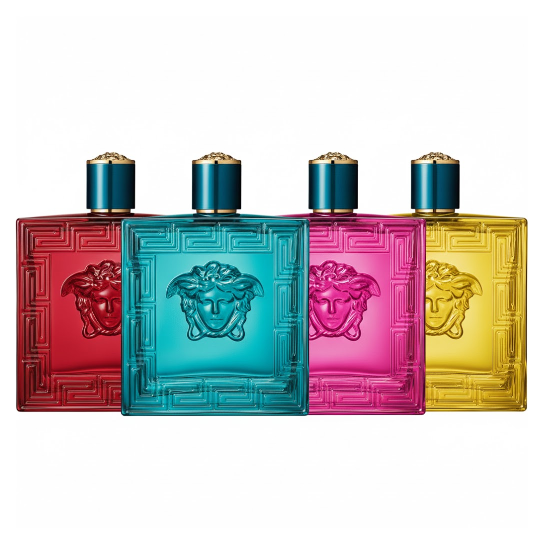 El frasco Eros Versace de 30 ml destaca por su imponente diseño en vidrio azul profundo, un color característico de la línea Eros que transmite fuerza, frescura y estilo. Presenta relieves geométricos inspirados en patrones griegos clásicos, aportando un acabado texturizado y visualmente llamativo. En el centro, el medallón de Medusa simboliza la identidad y el lujo propio de la marca Versace.